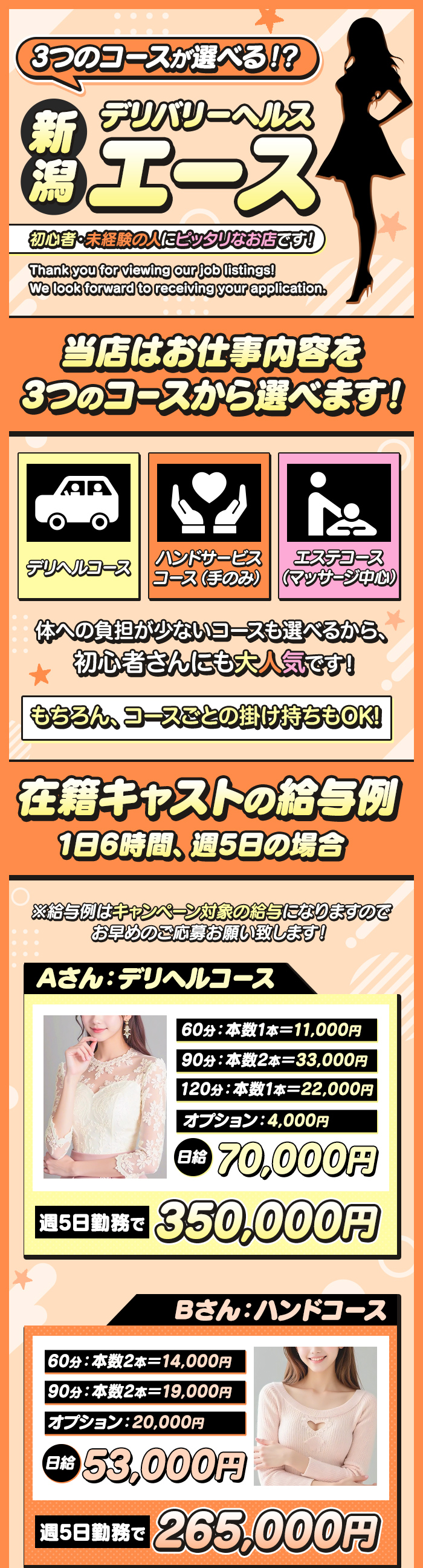 こんにちバニバニ!!デリバリーヘルスA(エース)副店くんです♪夜帯が不足しています!!新生活を迎える学生さんもなにかと出費がかさむ春!!お金はあるに越したことはないですよね♪♪今のうちにちょっぴり秘密のアルバイトいかがですか?☆初めてでも安心!!当店は優良会員様のみお届する顧客管理を日頃から実施しておりますので、安心してお仕事していただけます。☆優しいスタッフ!!みんな優しい(笑)女の子が働きやすいお店を目指しており、一人一人にあったアドバイスを心がけています。☆体験入店大歓迎!!今の風俗はテクニックよりハートです!!あなたの一生懸命がお客様の心を満たしていきます。未経験者大歓迎です!!※いつでも面接お伺いいたします!!お話だけでも遠慮なくご相談ください。『エース』に来るなら今がチャンスです!!入店5日間60分最高¥11000バック!!みなさんの『私これだけやれます!!』の思いが金額に反映されます!!エースは無敵を目指します!!!当店は長年新潟で営業しており、会員のお客様は多数いらっしゃいますので、面接からの体験入店でもお仕事入ります!!ご安心ください♪私たちのお店はみんなで作り上げていくお店です!!※キャストさんの募集はもちろんですが、スタッフさんの募集も随時行っております\(^o^)/https://www.gangan.bz/jobs/253/【もっと詳しく知りたい方はコチラ】↓↓↓↓↓▼担当者携帯▼080-2157-1055▼LINE ID▼@yrn7945c