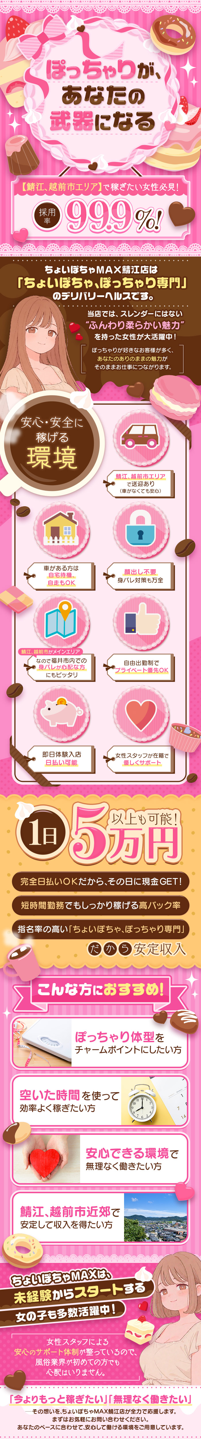 現在、福井県内のデリヘル店は福井市内に集中しております。鯖江市、越前市近郊に住んでおられる方でデリヘルのお仕事に興味あったけど福井市まで通うのは遠いな…生活の都合上通えないな…ご心配はいりません!ついに鯖江市にデリヘル店「ちょいぽちゃMAX鯖江店」がオープンしました!これで今の生活を変えないままやりたかったお仕事をして、お金を稼げるようになったのです‼また、福井市内に住んでいてデリヘルの仕事に興味があるけどお客さんが知り合いだったらどうしよう‥ 身バレがこわいな‥そう思って一歩踏み出せずにいた方もいらっしゃるのではないでしょうか?そういった方にもこのお店はピッタリです‼ちょいぽちゃMAX鯖江店の本拠地は鯖江で当店をご利用されるお客様の約9割は鯖江市、越前市のお客様です♪福井市の方でも身バレの心配なく、のびのびとお仕事をしていただけます‼もちろん、鯖江市、越前市の方の身バレ対策もばっちり整えてあります!福井市の方も鯖江市、越前市の方も是非一度ご連絡ください♪