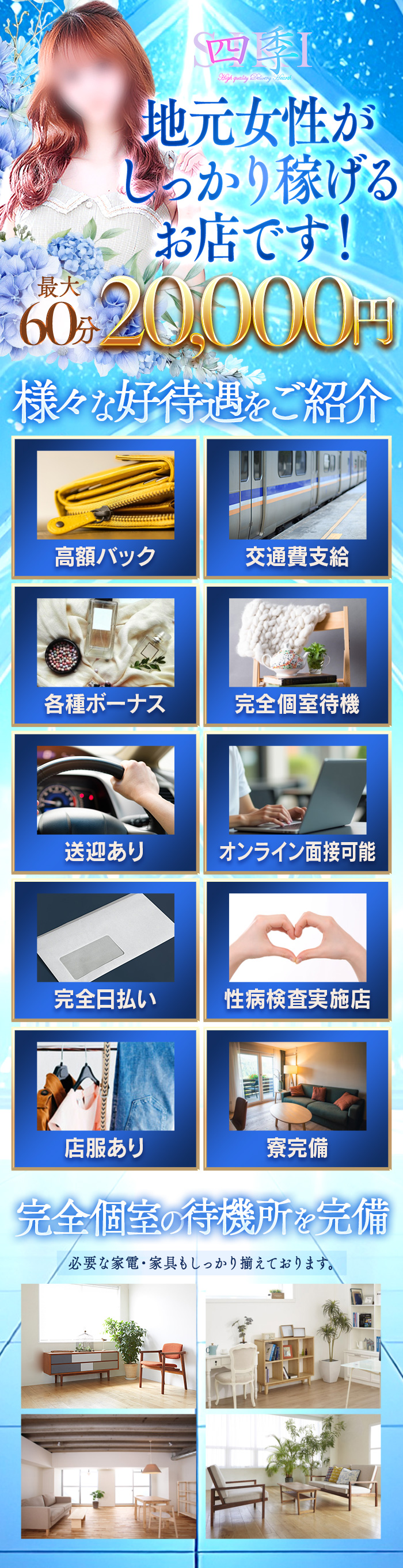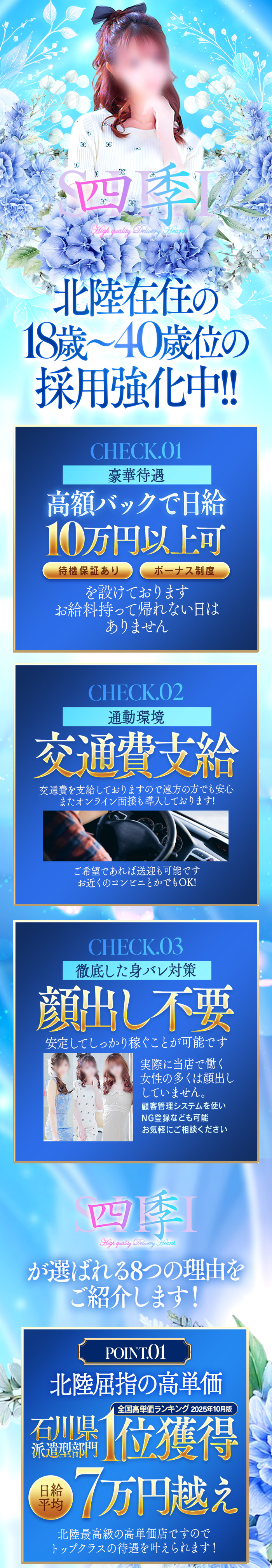 18歳〜40歳くらいの女性大募集中です♪貴女の最良のお店になる努力を四季〜SIKI〜は惜しみません!!本当に【いいお店】をみんなで作っていきませんか??当店ページを御覧いただきありがとうございます!求人担当たなかです♪当店四季のコンセプトは【働く女性を第一に】。いつでも貴女を最優先にさせていただきます!!そのために様々な取り組みを行っております!!『女の子ファースト』■ご希望は100%対応!【1日接客数3名限定】等の人数限定での接客、派遣不可なエリア、苦手プレイ、どんな事でもお気軽に教えて下さい!アナタの意見がお店を成長させてくれます!■安心の保証制度!保証の額以上に稼いで頂いていますが、不安なのは嫌ですよね??当店では待機保証制度をご用意しておりますので収入が¥0って事は絶対にありません!■安心して仕事が出来て稼げる環境!アナタを守る為にも、信頼を頂く為にもスタッフの教育は徹底しています!何でも相談出来る環境も整えています!■完全個室待機!夜職のイメージで「事務所が汚い」って声は本当にあるんですが、当店では絶対に思われないように毎日しっかりお掃除させていただいております!■当店は面接=入店ではありません!不安を解消してからお決め頂きたいので無理な勧誘や引き留めなど絶対に致しませんのでご安心ください!■掛け持ちでも大丈夫!学生、OL、主婦、看護師、キャバクラ、アルバイトなど時間帯が不規則な方でもサポート致します!アナタのペースに合わせて自由に働くお時間を決めてください!■完全自由出勤!当日の急遽出勤も大歓迎!生理休暇も勿論取ってください!アナタの都合に合わせて気軽に働けるのが一番良くないですか?1日1時間でも嬉しいですし、月に1日でも本当に嬉しいです!■罰金や引かれものなどは一切無し!備品はもちろん、ご希望でしたら衣装も貸し出し可能です!■徹底したプライバシーの保護!お問合せのヒミツは徹底的にお守り致します!勇気を出してお問合せ頂いた信頼を絶対に裏切りません!非通知でのお問合せ、匿名応募、SNSでのお問合せだけでも大丈夫です!◆信用第一◆■株式会社法人経営・風営法や税法に基づいて、会社単位の経営を行っています。違法な風俗店とは違い、警察への届出をしっかりと行い営業していますので安心です。■当店は法令に基づき、石川県公安委員会に対し無店舗型性風俗特殊営業届出確認書の提出を済ませています。などなどです!!他にも様々な取り組みを行っておりますしこれから皆様の意見をどんどん取り入れていってもっといいお店にしていきます!!四季〜SIKI〜に入店してよかった、そう言って卒業までしっかりサポートさせていただきますので是非ともご応募お待ちしておりますm(_ _)m〜☆★〜★☆〜☆★〜★☆〜☆★〜★☆〜☆★〜★☆〜☆★〜★☆〜18歳〜40歳くらいの女性を大募集中です!!高待遇をお約束します!!貴女の大切なお店選び、ぜひとも四季を候補に入れていただけませんか?絶対に後悔させません!!お話だけ、質問だけ、問い合わせだけでも構いません!ご応募お待ちしております!