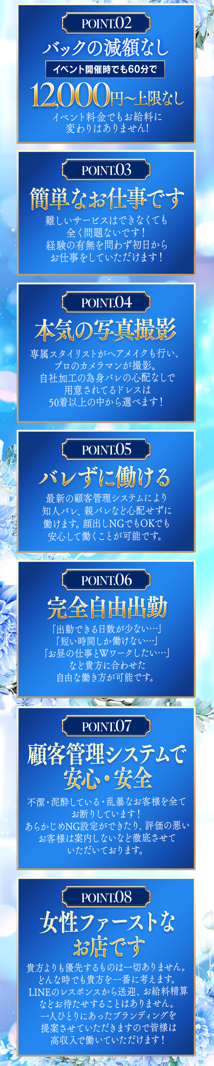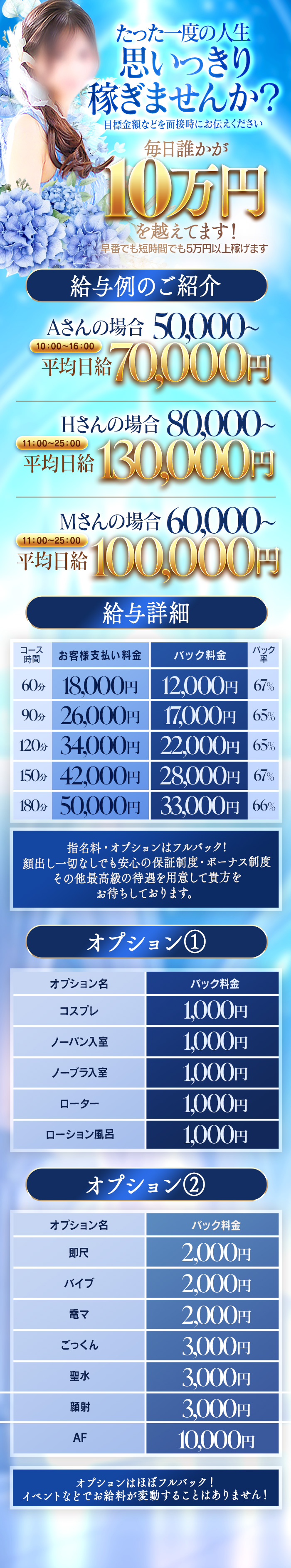 当店の価格帯は高めの料金設定になっております。 これにより紳士で余裕のあるお客様が多く安心してお仕事していただけます。 また、価格帯が高めなのでバックも60分12,000円〜と非常に高めに設定させていただいております。 出勤時間にもよりますが1日10万円を超えるキャスト様も珍しくありません。