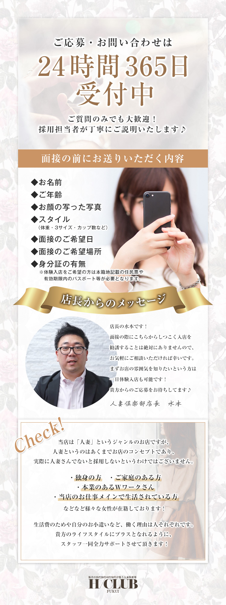 ☆移籍・掛け持ち大歓迎☆居心地が悪い思ったように稼げない対応が雑などなど・・・!今のお店に少しでも不満をおもちの方は要チェックです!【大型店ならではの特権】・圧倒的な集客力だからできる安定収入! 全国展開のJ-maxグループだからこその知名度で 他県からの出張の客様からも問い合わせが絶えません! もちろん短い出勤の方でも安定した収入をお約束いたします・完全保証制度! 安定収入と言われても不安はあると思います。 でも保証制度があればどんなことがあっても安心!・掛け持ちOK 様子見で体験入店何てことも可能なんです!・短い出勤でも送迎可能 福井市内ならどちらでもOK 離れたお住まいの方でもまずはご相談ください!そして今なら【面接へ来ただけで1万円プレゼント】【初出勤時に入店祝い金としてさらに1万円プレゼント】大型全国展開グループだからこそできる大特権です!!この機会に是非お越しください。どんなご質問でもお答えいたしますので少しでも気になった方!!まずはお問い合わせください♪お問い合わせTel:070-2250-2233ラインID:fukuihcメール:fukui@h-group.jp