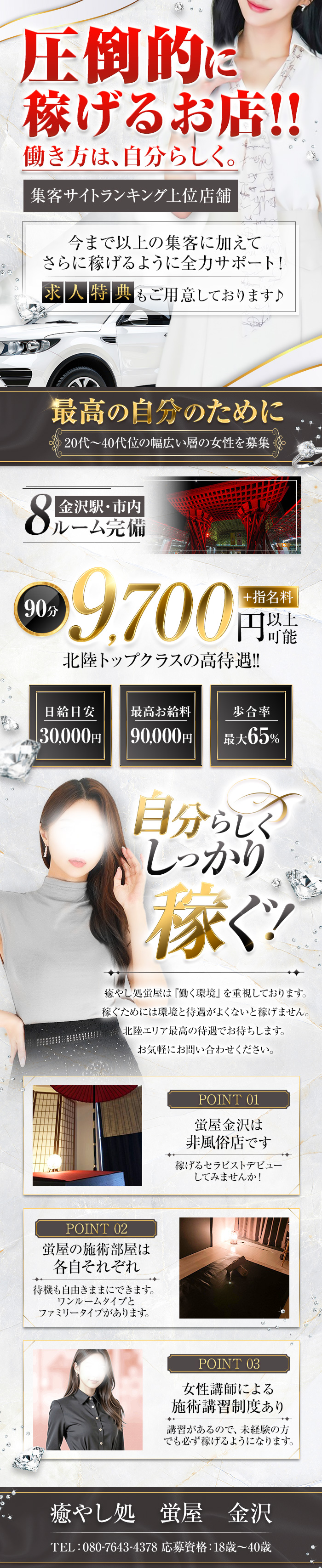 全額日払いと癒しの螢屋ライフこんにちは!広報主任にっしーです😊今日は「全額日払いで心おきなく働ける喜び」をテーマにお話しします💰当店「いやし処 螢屋 金沢店」は、金沢駅近くの落ち着いた空間で、完全健全なメンズエステとして、心の癒しを提供しています。そんな中で、全額日払いシステムは働く女性の皆さんにとって大きな安心材料なんです✨例えば、先日入店したばかりの未経験女性の話。彼女は「最初は緊張したけど、日払いだからすぐに収入が手に入ってホッとした」と笑顔で教えてくれました。平均日給22,000円〜33,000円が現実的で、5時間勤務で3万円以上稼げる方も多いんですよ!完全歩合制(バック率50%~65%)なので、努力が直接報酬につながるワクワク感もあります💎働きやすさも抜群。自由シフト制で週1日や1日4時間からOK、Wワークや副業も歓迎です。女性講師による無料マッサージ研修で、ディープリンパや撫子らしい品格ある施術を丁寧に学べます。「癒しは心のエネルギー」という当店のコンセプト通り、お客様に喜んでもらえる仕事で自分も輝けますよ!想像できますか?そんな毎日が。────────────────────────【お問い合わせ】☎️ TEL:080-7643-4378交通費支給・完全日払いOK!!✨少しでも気になった方は、お気軽にご連絡ください✨────────────────────────