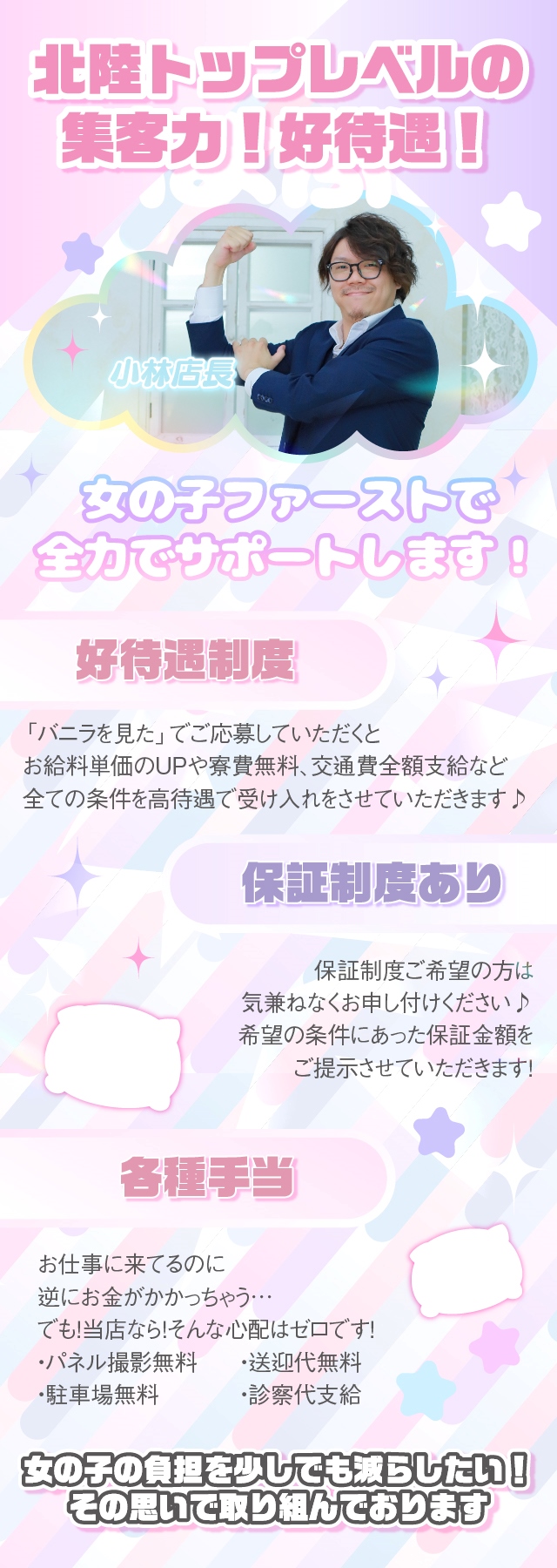 - 出勤時間に応じて交通費を支給させていただきます。北陸三県、関西、中部エリアからの出稼ぎの方は短期でも交通費優遇させていただきます♪関東圏、その他遠方からお越しの場合もお気軽にご相談ください♪