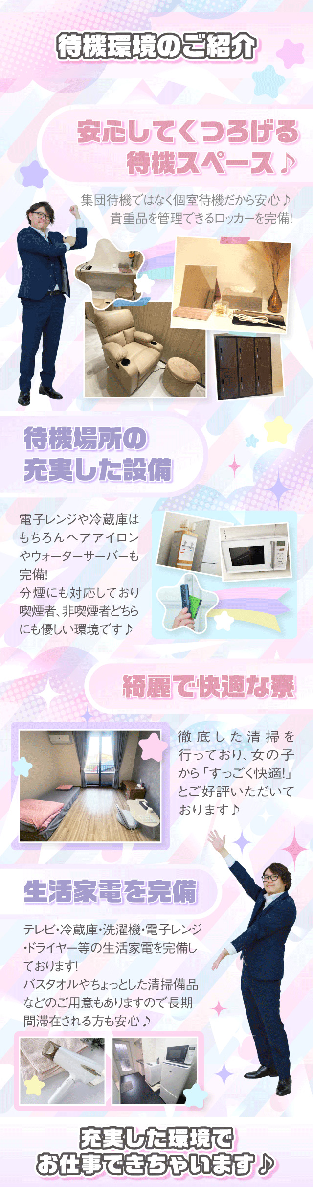 女の子のお仕事に対してノルマや罰金などがないお店だよ♪お店によっては、入店から◯ヶ月以降からはノルマが発生したり、無断欠勤などでは罰金になってしまうなどルールがあったりもするから、入店前にはしっかり聞いてみてね!