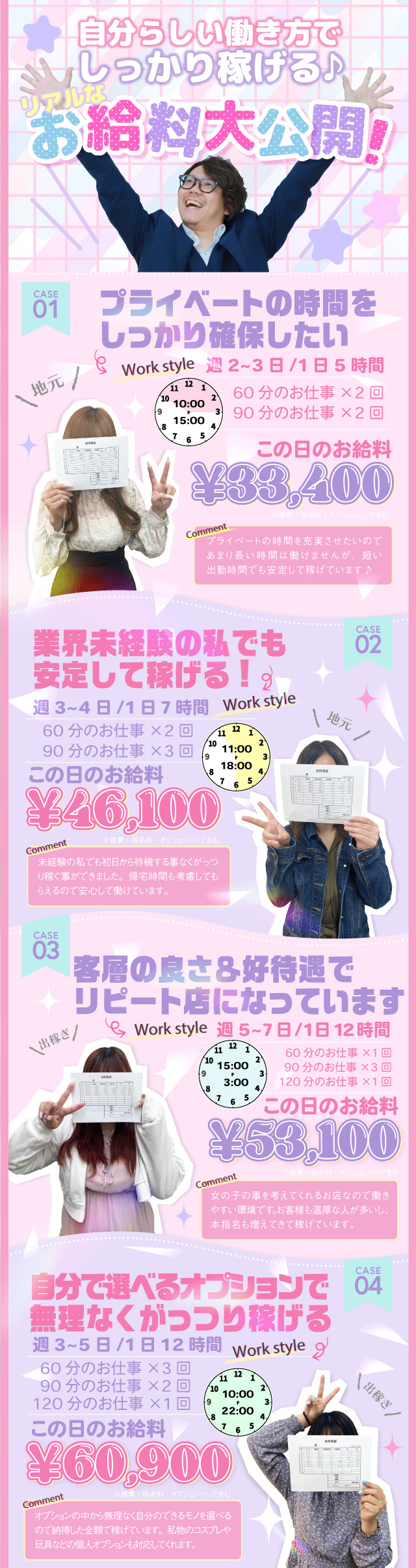 副業やWワークを歓迎しているお店だよ。時間が許す限りガンガン働いていお金を稼ぎたい女の子にはありがたいよね。シフトの入れ方にはお店ごとに決まりがあるから、詳しい条件は問い合わせてみよう♪
