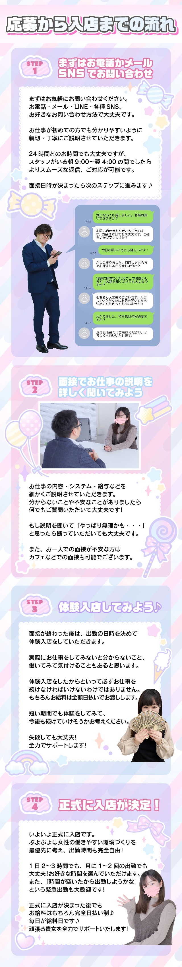 当店がプロデュースを1からしていきますのでご安心ください。 どんな女性でもよいところは必ずありますので そこを武器にして売り込んで参ります。 苦手な事、不安な事をじっくり話し合い、 女の子一人一人の売り方大事にしておりますのでご安心ください!!