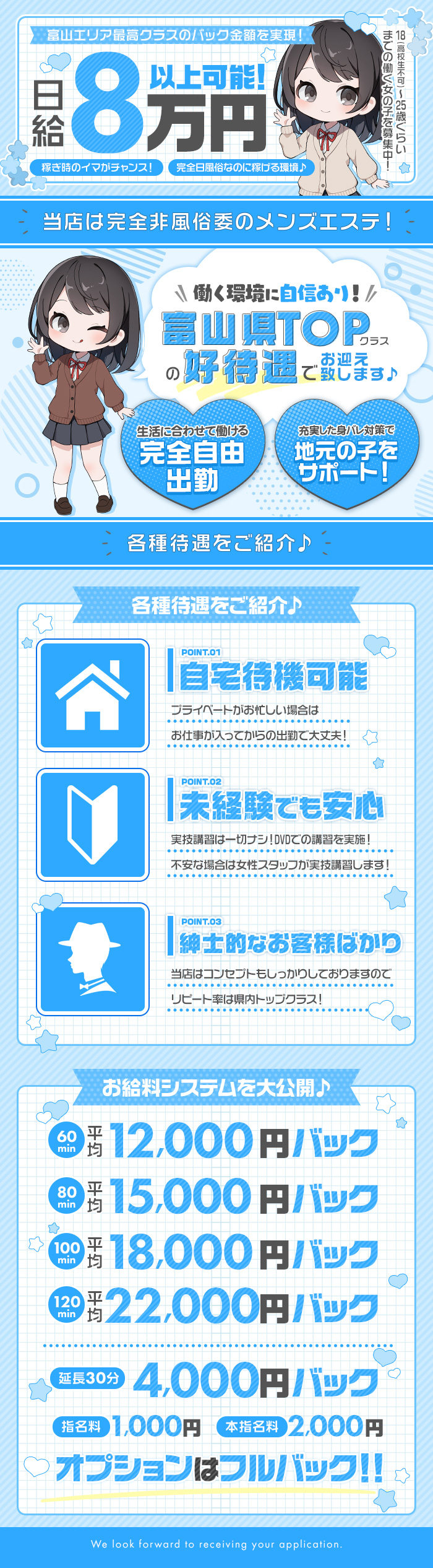 「通うには遠いな~」とか「引っ越ししたいな~」そんなときでも、お店が契約しているマンションを寮・宿泊施設として用意をしてくれるよ☆だから面倒な手続きもないし、家賃が無料や格安で、支払いも給料引きだったり融通が聞くから、必要な人は詳しく聞いてみてね♪