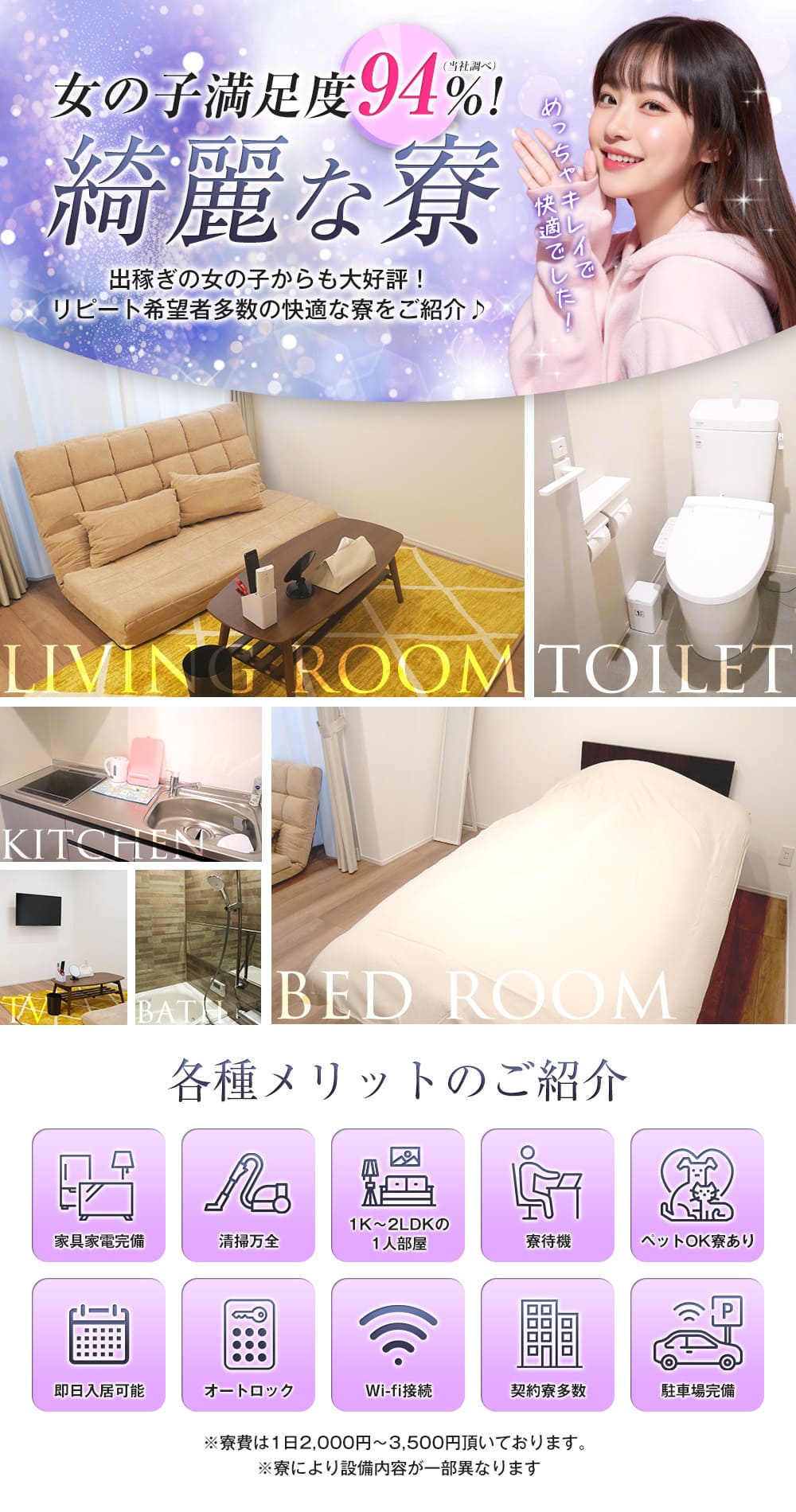 キャストからの高評価が自慢!収入面、設備面とも自信があります地元、出稼ぎ問わずキャストからの評判が高いという同店。“もんす”さんは「優しいお客様が多いうえにお給料が高いので、また出勤したいと思ってもらえるようです」と自信を見せていました。また設備の充実ぶりも大きな魅力。新築の待機所のほか、テレビ付きバスルームを備えた豪華な1LDK寮も用意されているそうです。