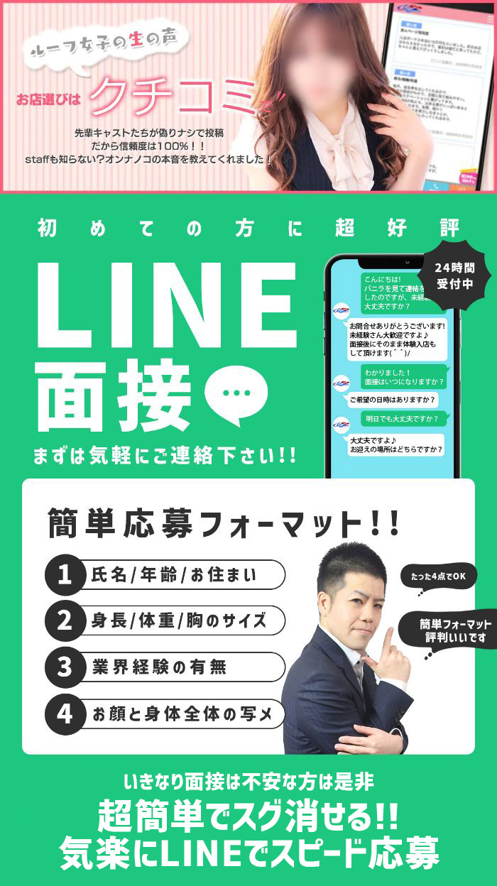 面接時は女性スタッフが担当してくれたのですが、 未経験なのでとてもリラックスしてお話できました! 無理な入店のお誘いもなく、 むしろ働きたい!と思えて入店を決意しました。 内容にも書いてある通り、女性スタッフの方が面接対応してくださいました。 男性スタッフによるセクハラ講習も一切なく、クリーンなお店...
